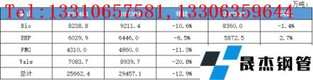 PBL&SP10L第一季度產量2338.6萬噸,環比下降11.1%,同比上升0.8%;PBF&SP10F第一季度產量3442.2萬噸,環比下降12.3%,同比下降5.8%;Robe L第一季度產量289.4萬噸,環比下降3.7%,同比上升35.0%;Robe F第一季度產量511.5萬噸,環比下降1.0%,同比上升36.5%;HIY第一季度產量1212.2萬噸,環比下降12.0%,同比下降11.3%;IOC Concentrate第一季度產量197.8萬噸,環比下降2.9%,同比下降6.4%;IOC Pellets第一季度產量254.2萬噸,環比上升9.1%,同比上升16.1%。