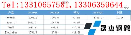 2024年第一季度,Rio鐵礦石總產量8238.8萬噸,環比下降10.6%,同比下降1.4。
