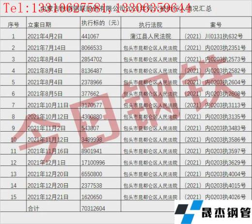 免責聲明:本網站(山東聊城晟杰無縫鋼管廠www.hanoilittle.com)刊載的“超7000萬!包鋼股份年內15次被法院執行!”等均源于網絡,版權歸原作者所有,且僅代表原作者觀點,本文所載信息僅供參考。轉載僅為學習與交流之目的,如無意中侵犯您的合法權益,請及時聯系刪除。本網站刊登此篇文章并不意味著本站贊同其觀點或證實其內容的真實性,我們不對其科學性、嚴肅性等作任何形式的保證。如果侵犯了您的版權,請盡快聯系我們予以撤銷,謝謝合作!