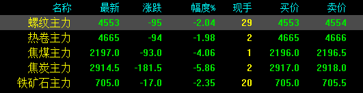 今日螺紋主力期貨跌95,收?qǐng)?bào)4553,跌幅2.04%;熱卷主力跌94,收?qǐng)?bào)4665,跌幅1.98%;焦煤主力跌93,收?qǐng)?bào)2197,跌幅4.06%;焦炭主力跌181.5,收?qǐng)?bào)2914.5,跌幅5.86%;鐵礦石主力跌17收?qǐng)?bào)705,跌幅2.35%。