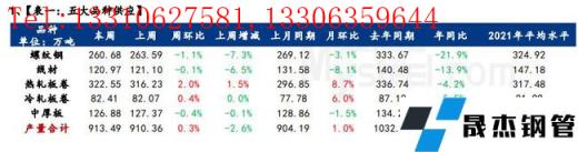 本周五大品種總庫存依然處于累庫趨勢,其中廠庫周環比增2.7%,月環比增3.6%,年同比降30.7%;社庫周環比增14.9%,月環比增27.6%,年同比減3.4%;總庫存周環比增11.2%,月環比增19.8%,年同比減13%。綜合來看,目前庫存累增幅度依舊略低于預期,本周社庫雖然大幅累增近157萬噸,但整體庫存水平依舊低于去年同期水平,主要原因在于2021年大面積執行能耗雙控,粗鋼及鋼材同比減量,使得入庫資源和市場流入資源大幅減量影響。綜合來看,春節需求停滯,庫存必然延續性累增,加之目前最強雨雪天氣襲來,碼頭、港口、陸路等卸貨均受阻,入庫節奏受限,因此節后增幅大概率比目前更加突出。