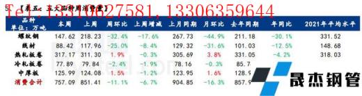 消費方面,本周五大品種周消費量增至757.09萬噸,環比減少94.32萬噸,降幅11.1%。其中建材環比減少100.15萬噸,降幅29.79%,板材環比增加5.83萬噸,增幅1.13%。