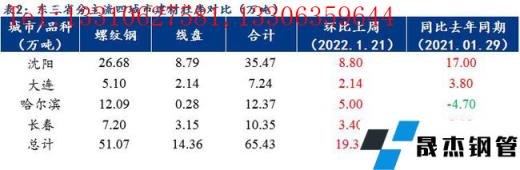 各主流城市分倉庫來看,本周沈陽市場幾大主流倉庫增庫較多;本周大連遠東鋼材市場新鵬輝到貨較多,其余倉庫新撫鋼也在陸續到貨。吉林省內長春兩大主流倉庫現貨庫存也在增加。從無縫鋼管廠家產量及庫存來看,本周區域內樣本無縫鋼管廠家總產量43.1萬噸,較上周增.9萬噸;廠庫總量12.56萬噸,較上周減少1.01萬噸,社庫則大幅度增20.24萬噸;本周無縫鋼管廠家產量增、廠庫降、社庫繼續大增,主要原因是部分無縫鋼管廠家復產、產量略有回升,廠庫繼續前移至市場,而貿易商由于下游無需求幾乎也無成交,預計春節過后區域內社會庫存將繼續增加。
