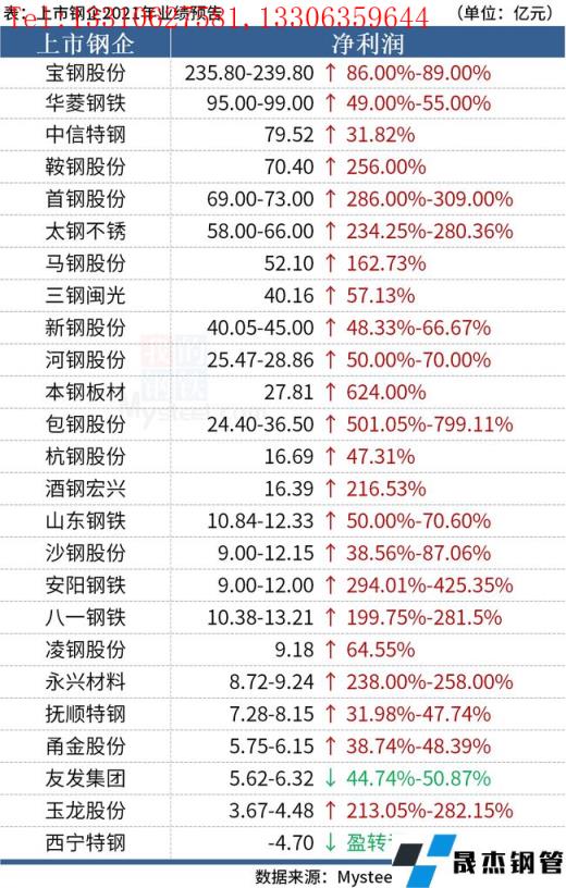 免責聲明:本網站(山東聊城晟杰無縫鋼管廠www.hanoilittle.com)刊載的“24家上市鋼企業績飄紅,9家實現凈利潤翻倍增長”等均源于網絡,版權歸原作者所有,且僅代表原作者觀點,本文所載信息僅供參考。轉載僅為學習與交流之目的,如無意中侵犯您的合法權益,請及時聯系刪除。本網站刊登此篇文章并不意味著本站贊同其觀點或證實其內容的真實性,我們不對其科學性、嚴肅性等作任何形式的保證。如果侵犯了您的版權,請盡快聯系我們予以撤銷,謝謝合作!