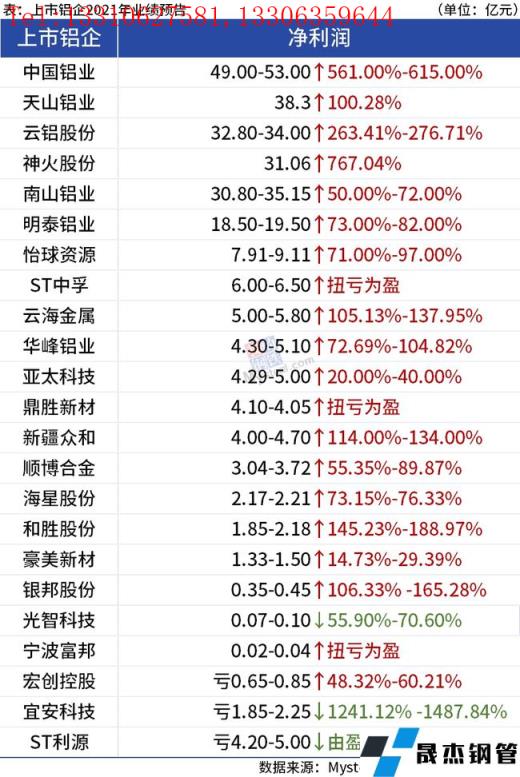 免責聲明:本網站(山東聊城晟杰無縫鋼管廠www.hanoilittle.com)刊載的“23家上市鋁企披露2021年業績預報,超8成凈利潤增長”等均源于網絡,版權歸原作者所有,且僅代表原作者觀點,本文所載信息僅供參考。轉載僅為學習與交流之目的,如無意中侵犯您的合法權益,請及時聯系刪除。本網站刊登此篇文章并不意味著本站贊同其觀點或證實其內容的真實性,我們不對其科學性、嚴肅性等作任何形式的保證。如果侵犯了您的版權,請盡快聯系我們予以撤銷,謝謝合作!