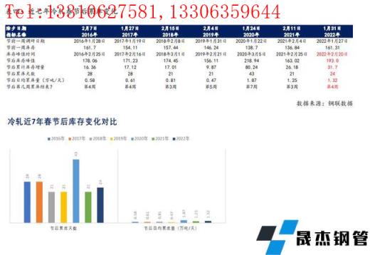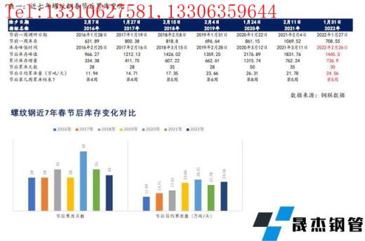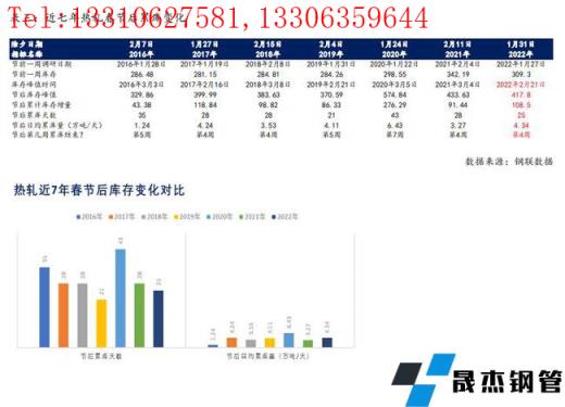 與螺紋鋼原因相對一致,2020年春節后累庫天數長達43天,節后第7周首次出現降庫趨勢。2016年至2019年,以及2021年,線材春節后累庫天數基本維持在21-35天,并在節后第3-5周首次出現降庫趨勢。依據建筑厚壁無縫鋼管品種屬性基本相似的慣例來看,2022年線材節后預計累庫天數也將達到30天左右,節后日均累庫9.72萬噸/天,同比2021年高24%左右,節后第4周達到峰值,庫存峰值同比低4%左右。