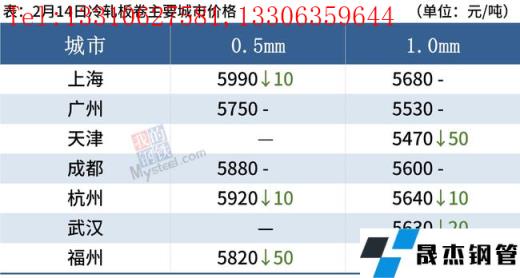 冷軋板卷:2月14日,全國24個主要城市1.0mm冷卷均價5611元/噸,較上個交易日下跌9元/噸。今日開盤黑色系期貨價格寬幅走跌,熱軋現(xiàn)貨價格大幅回落,冷軋市場部分城市跟跌。據(jù)反饋,商戶全面復(fù)工復(fù)產(chǎn),下游終端用戶采購積極性偏差,冷軋成交偏弱。心態(tài)面看,市場商戶對本周行情整體偏謹慎,局部市場庫存壓力較大,商戶多出貨為主。預(yù)計15日全國冷軋板卷現(xiàn)貨價格多震蕩下調(diào)為主。