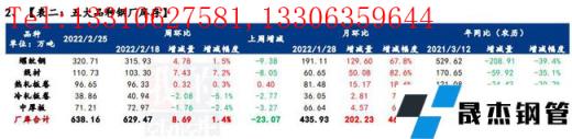 免責聲明:本網站(山東聊城晟杰無縫鋼管廠www.hanoilittle.com)刊載的“解讀:聚焦鋼鐵產業數據(2月24日)—板材總庫存首次去化,建材延續供庫雙增”等均源于網絡,版權歸原作者所有,且僅代表原作者觀點,本文所載信息僅供參考。轉載僅為學習與交流之目的,如無意中侵犯您的合法權益,請及時聯系刪除。本網站刊登此篇文章并不意味著本站贊同其觀點或證實其內容的真實性,我們不對其科學性、嚴肅性等作任何形式的保證。如果侵犯了您的版權,請盡快聯系我們予以撤銷,謝謝合作!