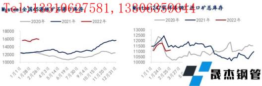 港口庫存:截至2月25日,統(tǒng)計(jì)45港港口庫存總量15886.57萬噸,月環(huán)比累庫576.64萬噸,在港船舶降44條至130條。本月度內(nèi)港口鐵礦石到港量較上月減量超1000萬噸,但隨著鐵礦到港的減少,港口壓港也逐漸緩解,疊加春節(jié)期間運(yùn)力下降、無縫厚壁鋼管廠家需求減弱,港口疏港也有較大幅度的回調(diào),最終港口庫存得以累庫。分國(guó)別庫存來看,截至2月25日,45港澳礦環(huán)比累庫530.84萬噸至7583.09萬噸,巴西礦則環(huán)比小降11.74萬噸至5335.1萬噸。