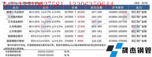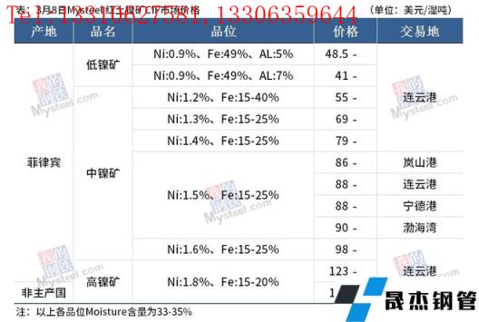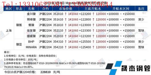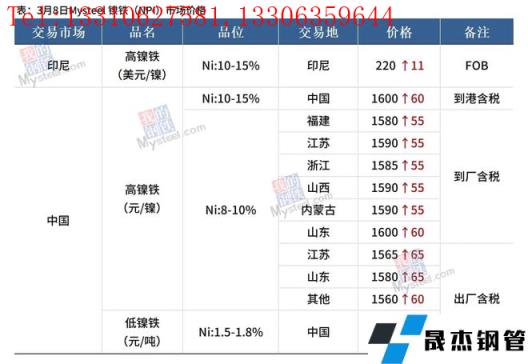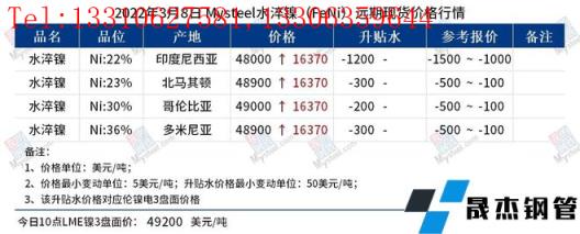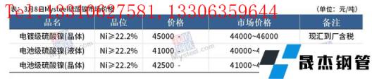 免責(zé)聲明:本網(wǎng)站(山東聊城晟杰無縫鋼管廠www.hanoilittle.com)刊載的“鎳產(chǎn)業(yè)鏈價(jià)格(2022.3.8)”等均源于網(wǎng)絡(luò),版權(quán)歸原作者所有,且僅代表原作者觀點(diǎn),本文所載信息僅供參考。轉(zhuǎn)載僅為學(xué)習(xí)與交流之目的,如無意中侵犯您的合法權(quán)益,請(qǐng)及時(shí)聯(lián)系刪除。本網(wǎng)站刊登此篇文章并不意味著本站贊同其觀點(diǎn)或證實(shí)其內(nèi)容的真實(shí)性,我們不對(duì)其科學(xué)性、嚴(yán)肅性等作任何形式的保證。如果侵犯了您的版權(quán),請(qǐng)盡快聯(lián)系我們予以撤銷,謝謝合作!