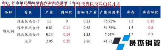 1、調(diào)研數(shù)據(jù)顯示,統(tǒng)計(jì)的河南地區(qū)10家建筑厚壁無(wú)縫鋼管樣本無(wú)縫厚壁鋼管廠家中,河南省建材無(wú)縫厚壁鋼管廠家螺紋鋼日產(chǎn)量2.05萬(wàn)噸,產(chǎn)量較上周增加0.25萬(wàn)噸。檢修/限產(chǎn)影響建材日產(chǎn)量為2.86萬(wàn)噸,產(chǎn)能利用率為41.75%,較上周增加13.89%。