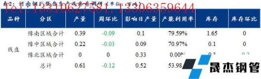 1、調(diào)研數(shù)據(jù)顯示,統(tǒng)計(jì)的河南地區(qū)10家建筑厚壁無(wú)縫鋼管樣本無(wú)縫厚壁鋼管廠家中,河南省無(wú)縫厚壁鋼管廠家線盤日均產(chǎn)量0.61萬(wàn)噸,較上周產(chǎn)量減少0.12萬(wàn)噸;線盤產(chǎn)能利用率53.98%,較上周下降16.44%。