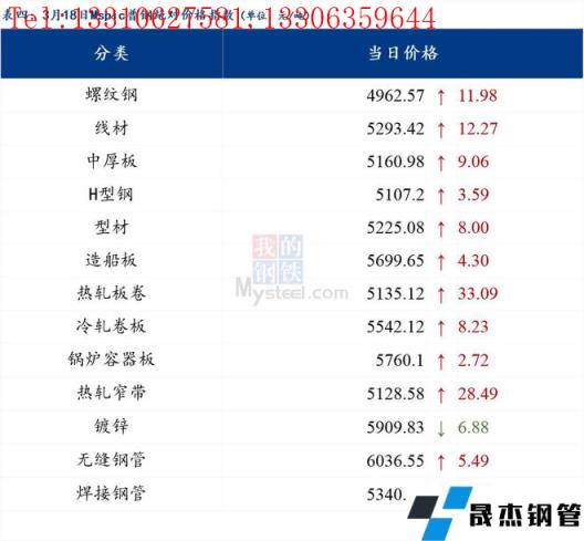 3月18日普鋼絕對價格指數變化:綜合指數5209.05,上漲15.43;螺紋鋼指數4962.57,上漲11.98;線材指數5293.42,上漲12.27;熱軋板卷指數5135.12,上漲33.09;冷軋板卷指數5542.12,上漲8.23;中厚板指數5160.98,上漲9.06。