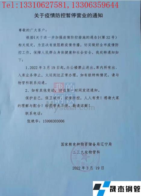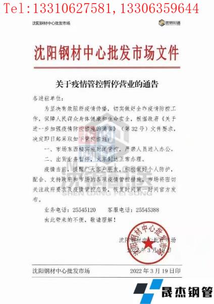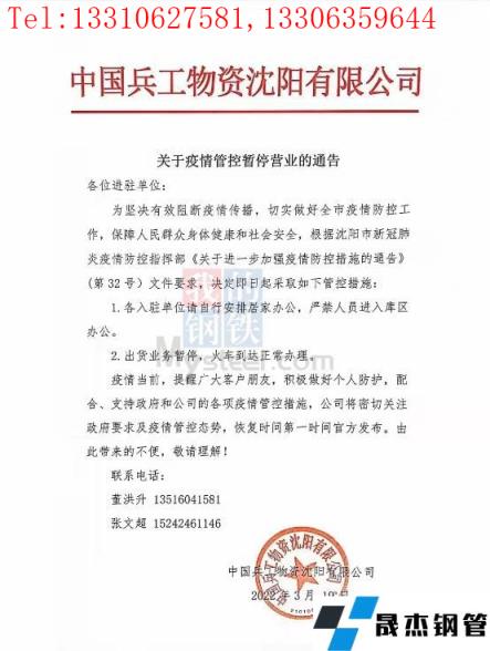目前沈陽厚壁無縫鋼管中心批發(fā)市場已發(fā)布通告,19日起北一西路東西樓試試封閉管控、嚴禁人員進入辦公,出庫業(yè)務(wù)暫停、火車到達正常辦理;中國兵工物資125庫通告19日起嚴禁人員進入庫區(qū)辦公,出庫業(yè)務(wù)暫停、火車到達正常辦理;國家糧食和物資儲備局遼寧局二三九處通告19日起辦公樓嚴禁進出,庫內(nèi)所有出入庫業(yè)務(wù)暫停、火運到達正常辦理。市內(nèi)其他主要厚壁無縫鋼管市場反饋暫時正常辦公及出庫,但從防控指揮部通告內(nèi)容來看、也有暫停營業(yè)的傾向。(通告見文末圖片)