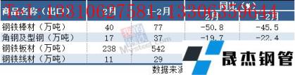 2月,中國出口鋼鐵棒材40萬噸,同比下降50.8%;1-2月累計出口77萬噸,同比下降45.5%。其他出口情況如下表所示: