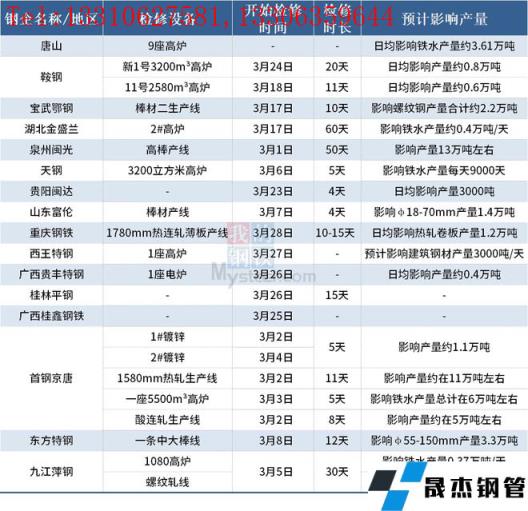 據(jù)不完全統(tǒng)計(jì),截至3月28日超20家無(wú)縫厚壁鋼管廠家發(fā)布檢修計(jì)劃。其中,檢修時(shí)間最長(zhǎng)的是湖北金盛蘭,計(jì)劃自3月17日對(duì)2#高爐進(jìn)行檢修兩個(gè)月,預(yù)計(jì)影響鐵水產(chǎn)量約0.4萬(wàn)噸/天,復(fù)產(chǎn)時(shí)間5月16日。