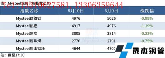 ◎5月10日焦炭市場偏弱運行,部分無縫厚壁鋼管廠家開啟第二輪降價,降幅為200元/噸,主流無縫厚壁鋼管廠家暫觀望為主。焦炭開工小幅微增,場內(nèi)基本零庫存運行,即產(chǎn)即銷,多以積極出貨為主。詳情>>