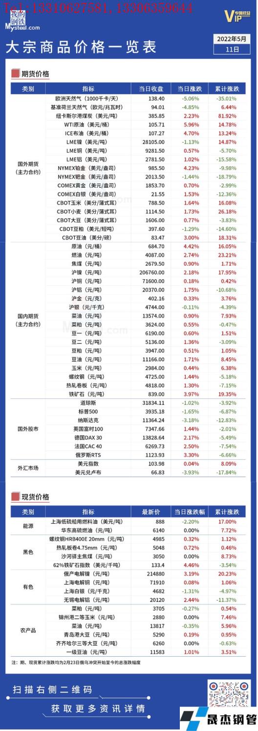免責聲明:本網站(山東聊城晟杰無縫鋼管廠www.hanoilittle.com)刊載的“俄烏局勢丨大宗商品價格一覽表(5月11日)”等均源于網絡,版權歸原作者所有,且僅代表原作者觀點,本文所載信息僅供參考。轉載僅為學習與交流之目的,如無意中侵犯您的合法權益,請及時聯系刪除。本網站刊登此篇文章并不意味著本站贊同其觀點或證實其內容的真實性,我們不對其科學性、嚴肅性等作任何形式的保證。如果侵犯了您的版權,請盡快聯系我們予以撤銷,謝謝合作!