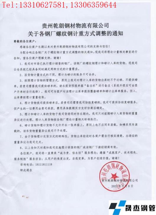 免責聲明:本網站(山東聊城晟杰無縫鋼管廠www.hanoilittle.com)刊載的“貴州乾朗鋼材_無縫鋼管物流有限公司關于各無縫鋼管廠家螺紋鋼計重方式調整的通知”等均源于網絡,版權歸原作者所有,且僅代表原作者觀點,本文所載信息僅供參考。轉載僅為學習與交流之目的,如無意中侵犯您的合法權益,請及時聯系刪除。本網站刊登此篇文章并不意味著本站贊同其觀點或證實其內容的真實性,我們不對其科學性、嚴肅性等作任何形式的保證。如果侵犯了您的版權,請盡快聯系我們予以撤銷,謝謝合作!