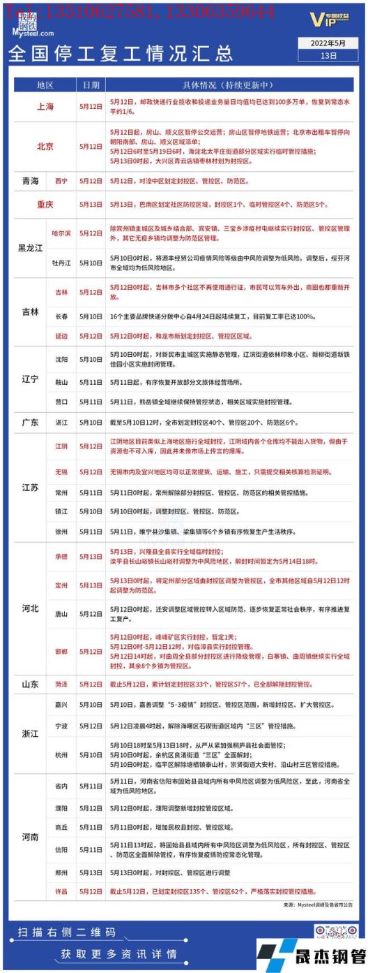 截至5月13日,據不完全統計,共有13個省份發布了停工復工最新信息。江陰、承德繼續施行全域封控。北京多區實施管控措施。菏澤全部解除封控管控。具體情況如下: