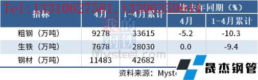 1-4月,中國粗鋼產(chǎn)量33615萬噸,同比下降10.3%;生鐵產(chǎn)量28030萬噸,同比下降9.4%;厚壁無縫鋼管產(chǎn)量42682萬噸,同比下降5.9%。