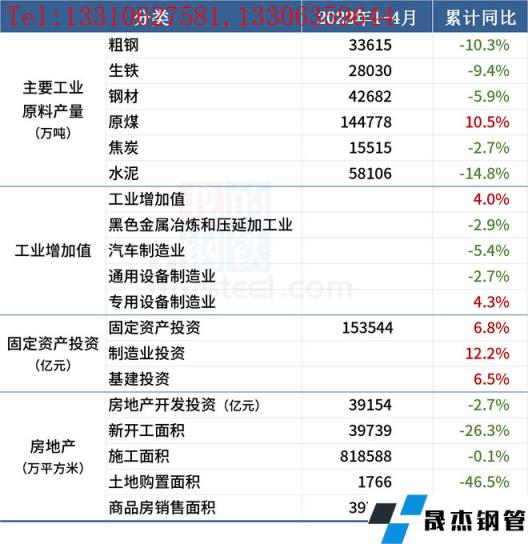 1-4月份,全國規模以上工業增加值同比增長4.0%,比1-3月份回落2.5個百分點。4月全國粗鋼日均產量309.27萬噸,環比增長8.6%。