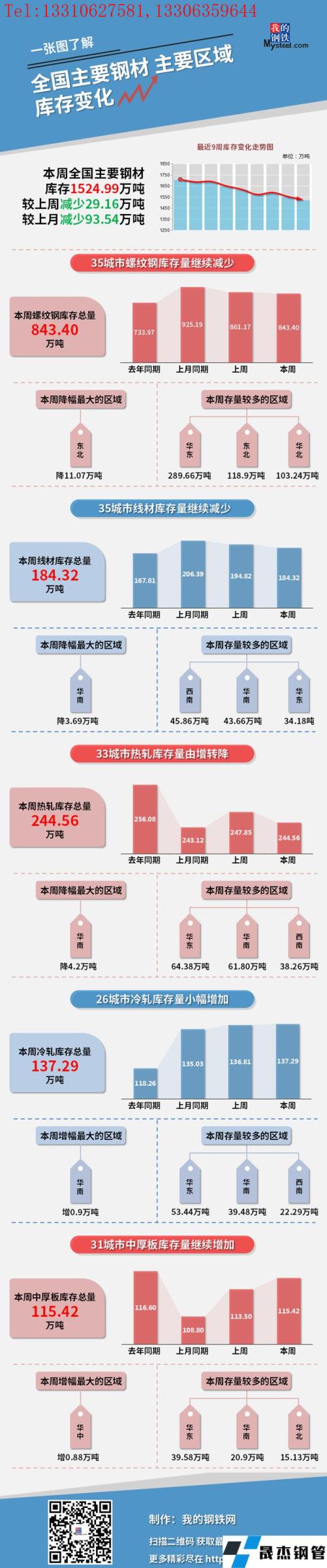 本周,全國主要厚壁無縫鋼管社會庫存1524.99萬噸,較上周減少29.16萬噸,較上月減少93.54萬噸;螺紋鋼庫存總量843.4萬噸。