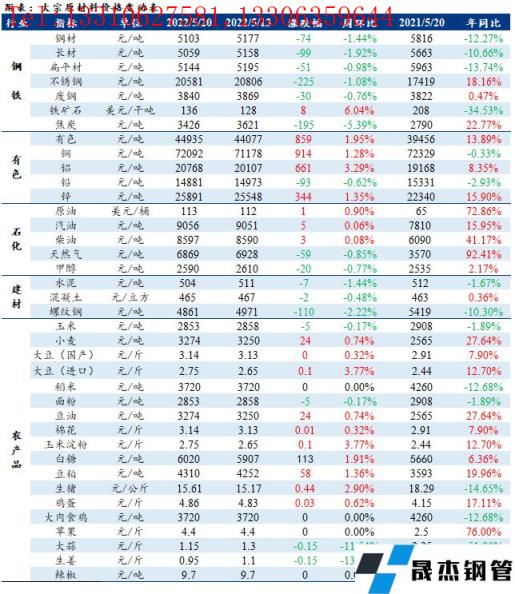 免責聲明:本網站(山東聊城晟杰無縫鋼管廠www.hanoilittle.com)刊載的“周報:大宗工業原材料、能源及農產品價格周報(5.16-5.20)”等均源于網絡,版權歸原作者所有,且僅代表原作者觀點,本文所載信息僅供參考。轉載僅為學習與交流之目的,如無意中侵犯您的合法權益,請及時聯系刪除。本網站刊登此篇文章并不意味著本站贊同其觀點或證實其內容的真實性,我們不對其科學性、嚴肅性等作任何形式的保證。如果侵犯了您的版權,請盡快聯系我們予以撤銷,謝謝合作!