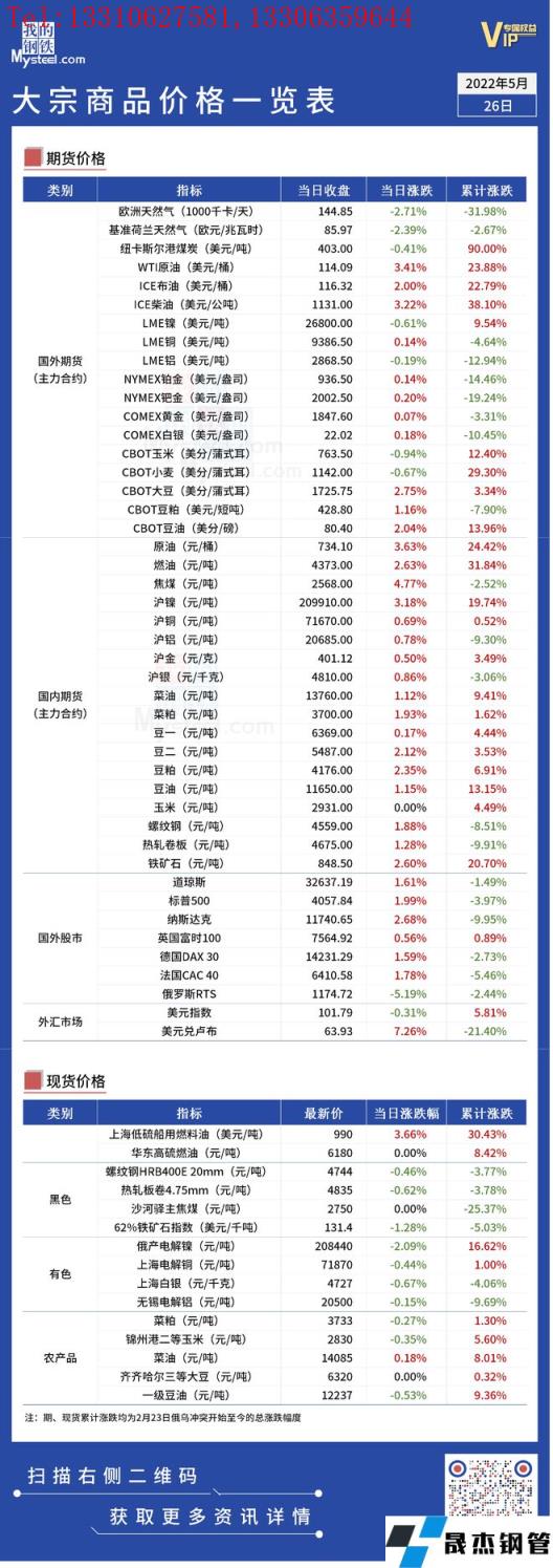 免責聲明:本網站(山東聊城晟杰無縫鋼管廠www.hanoilittle.com)刊載的“俄烏局勢丨大宗商品價格一覽表(5月26日)”等均源于網絡,版權歸原作者所有,且僅代表原作者觀點,本文所載信息僅供參考。轉載僅為學習與交流之目的,如無意中侵犯您的合法權益,請及時聯系刪除。本網站刊登此篇文章并不意味著本站贊同其觀點或證實其內容的真實性,我們不對其科學性、嚴肅性等作任何形式的保證。如果侵犯了您的版權,請盡快聯系我們予以撤銷,謝謝合作!
