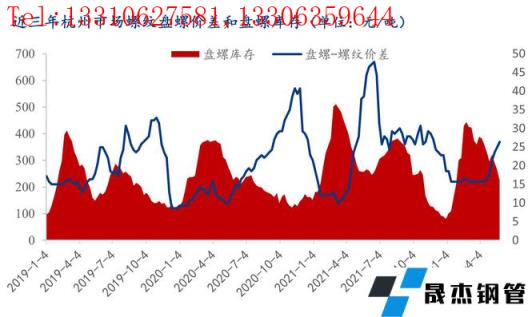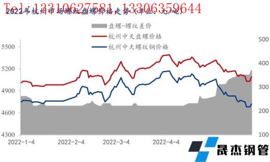 2022年初起受需求偏弱,庫存持續居高不下影響,浙江市場主流無縫厚壁鋼管廠家盤螺螺紋價差基本穩定在200元/噸附近水平。而4月下旬以來,主流無縫厚壁鋼管廠家盤螺與螺紋價差逐步擴大,到5月下旬有進一步擴大的趨勢。截止5月27日,以杭州市場為例,中天HRB40016-25mm螺紋鋼4700元/噸,中天HRB4008-10mm盤螺5080元/噸,盤螺價格高于螺紋鋼380元/噸,由此浙江市場盤螺價格再次成為全國相對高位。近期浙江各市場盤螺庫存加速去化,主流無縫厚壁鋼管廠家盤螺與螺紋價差走勢有進一步擴大的趨勢。筆者調研了解到主要有以下幾點原因,給大家做個簡要分析: