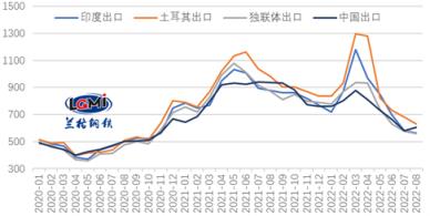 7月份,出口市場競爭激烈,主要出口國繼續(xù)下調(diào)厚壁鋼管出口報(bào)價(jià)。進(jìn)入8月份,海外需求持續(xù)疲弱,各國厚壁鋼管出口報(bào)價(jià)仍有所下調(diào),而國內(nèi)市場出現(xiàn)反彈,出口報(bào)價(jià)有所上漲,云商平臺監(jiān)測數(shù)據(jù)顯示,2022年8月5日,印度、土耳其、獨(dú)聯(lián)體熱軋卷板出口報(bào)價(jià)(FOB)分別為565美元/噸、630美元/噸和560美元/噸,均較7月底有所下跌,中國熱軋卷板出口報(bào)價(jià)(FOB)為605美元/噸,較7月底有所上漲。