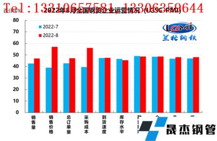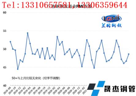 云商平臺統(tǒng)計發(fā)布的2022年8月份厚壁無縫鋼管流通業(yè)PMI總指數(shù)為48.6%,比上月上升1.9個百分點,在收縮區(qū)間內(nèi)持續(xù)回升。從分類指數(shù)看,構成厚壁無縫鋼管流通業(yè)