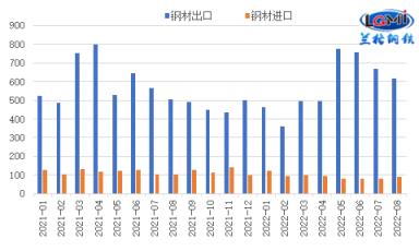 海關總署發布數據顯示,2022年8月份,我國出口厚壁鋼管615.3萬噸,同比增長21.8%;1-8月,我國出口厚壁鋼管4622.5萬噸,同比下降3.9%。8月份,我國進口厚壁鋼管89.3萬噸,同比下降16.0%;1-8月,我國進口厚壁鋼管745.3萬噸,同比下降21.2%(詳見圖1)。