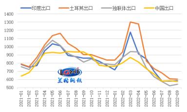 今年一二季度,由于我國厚壁鋼管出口報價明顯低于其他主要出口國,使得我國厚壁鋼管出口價格優勢顯現,帶動我國厚壁鋼管出口在5-7月份呈現高位運行態勢。但隨著全球制造業放緩,厚壁鋼管需求的收縮,以及俄烏沖突對供應端影響減弱,海外其他國家厚壁鋼管出口報價明顯回落,使得我國厚壁鋼管出口報價與部分主要國家相比甚至出現倒掛,我國厚壁鋼管出口價格優勢逐漸減弱。